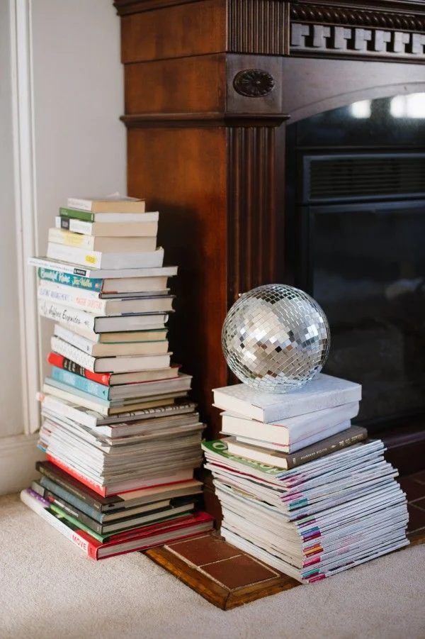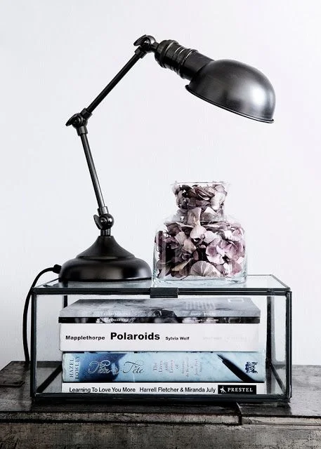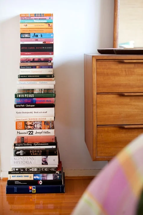 Mér finnst bækur gera heimili að heimili. Bækur þurfa ekki alltaf að vera í hillum. Það er auðvelt að skreyta með bókum á óhefðbundinn hátt, raða þeim á gólf eða á borð og setja fallega hluti ofan á eins og sést hér myndunum. Njótið og gleðilgt sumar.